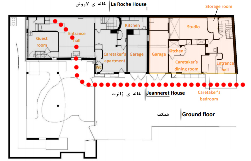 اول، به عنوان مسیر و فضایی عمودی که کف (طبقه) های افقی را بریده است. این رمپ قابلیت را می دهد تا فرد در فضا حرکت کند، ببیند، بچرخد و به طبقه ی فوقانی برود. در این ویلا پله نیز وجود دارد که به با فاصلهی کمی از رمپ قرار گرفته است. بعد از وارد شدن به این طبقه فرد می تواند به هال برود یا وارد تراس شود. در اینجاست که رمپ از رمپی داخلی به رمپی خارجی تبدیل شده و در مجاورت هوای باز قرار می گیرد. با بالا رفتن به طبقه ی بعدی با دیوار ها منحنی شکلی مواجه می شویم که بازشویی در آن، دید منظری در دوردست را برای ما قاب می کند.
