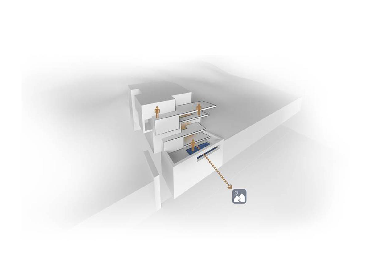 3- یکی از چالش های بنا قرارگیری در شیب حدود 45% می باشد؛ که با در نظر گرفتن طراحی سازه ای و ترکیب آن با معماری، تفکیک فضایی در بنا ایجاد گردیده است. ورودی بنا در قسمت پایین شیب بوده که پارکینگ ها و فضای انباری ها را شامل گشته و کاربر با طی نمودن پلکان ورودی و آسانسور به فضای لابی پروژه می رسد که یکی از شاخصه های بنا و نشانه ای از نما که به داخل کشیده شده، می باشد.